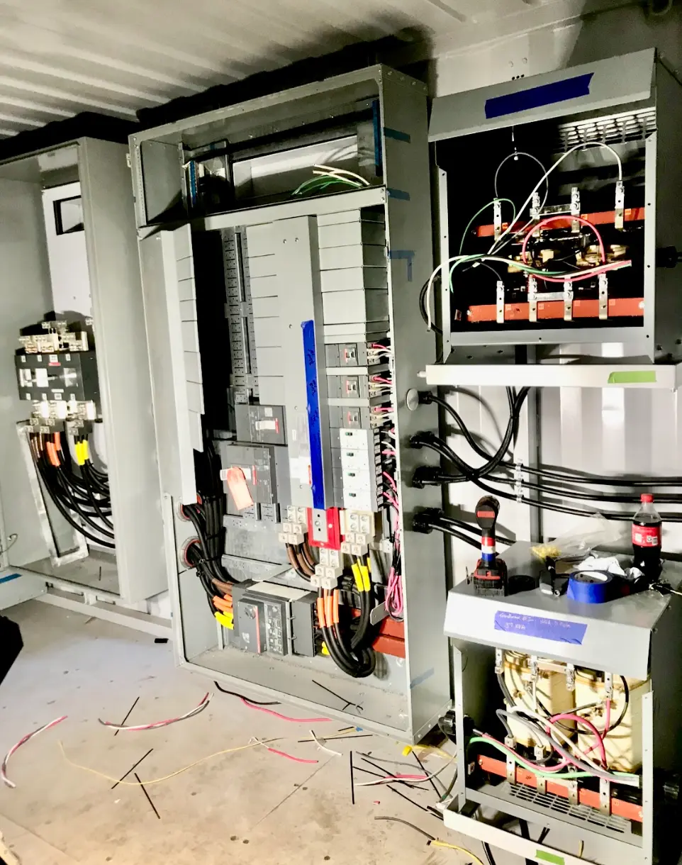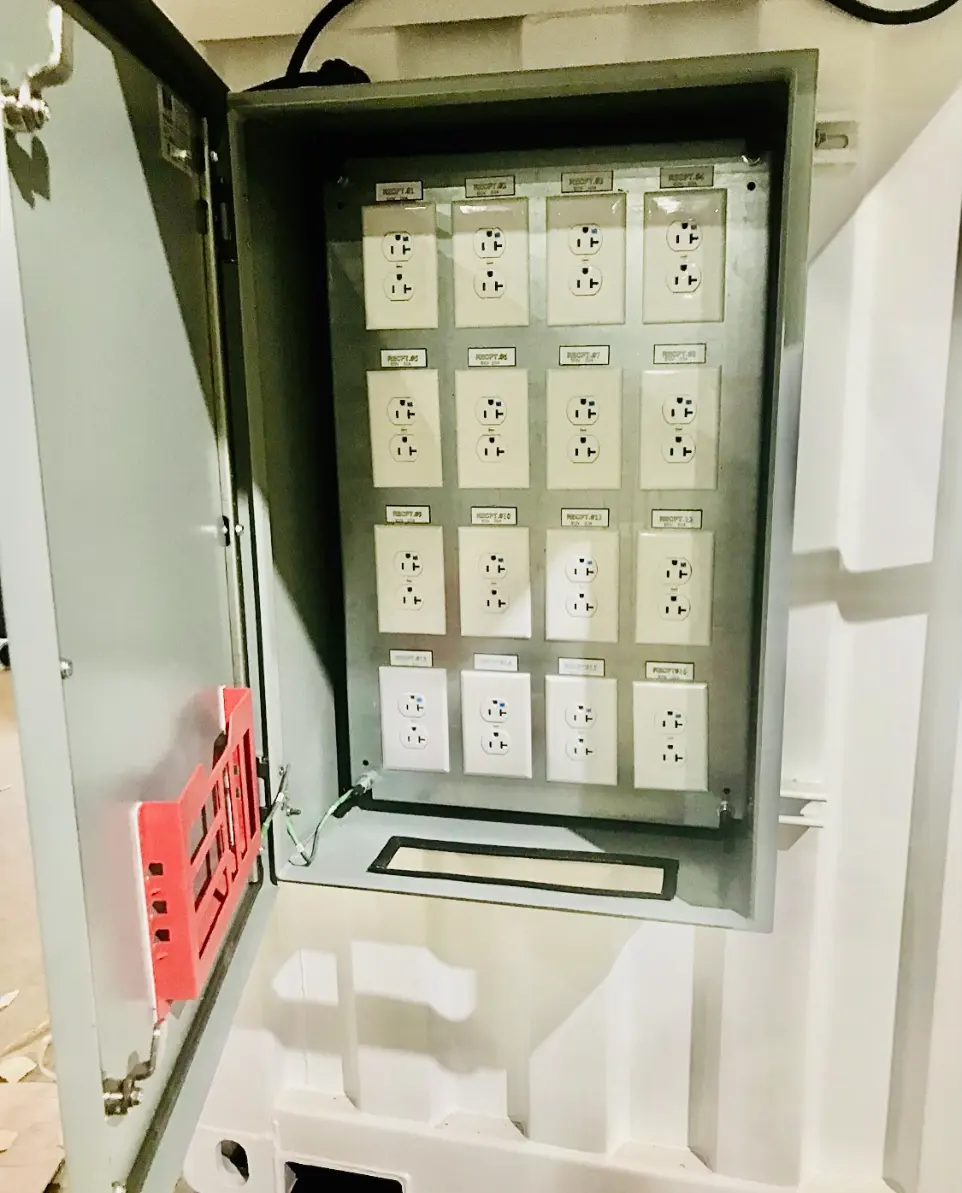 Containers come with lighting and lighting panels, 120v/240v outlets, emergency exit signs, breaker distribution panels, drives, soft starts, across the line starters, PLC and computerized systems. Contact us today to get started on you customized equipment containers!